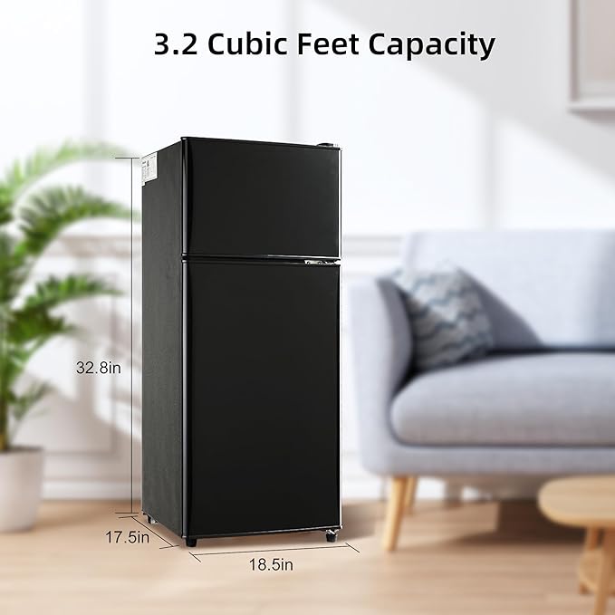 - 【Space-Saving Design with Generous Capacity】Discover the perfect blend of compactness and ample storage. Measuring just 16.7 x 17.5 x 34 inches, this refrigerator fits seamlessly into any living space while offering a total capacity of 3.2 cu. ft. The larger 1.2 cu. ft. freezer section and 2.0 cu. ft. refrigerator section provide plenty of room for all your essentials.
