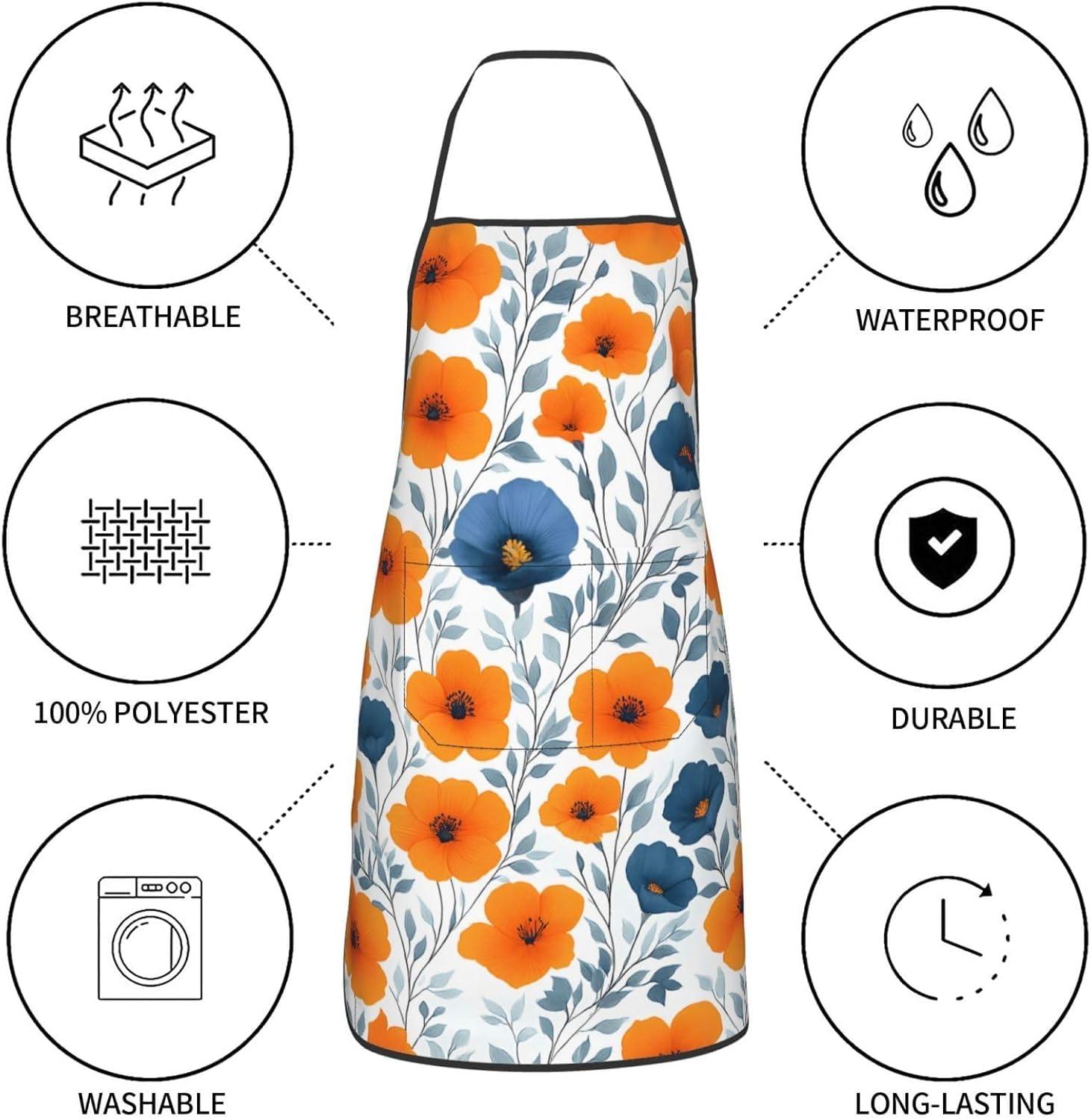 - Material: Made of high quality polyester, this orange and blue flower apron is durable, breathable, and waterproof, providing excellent protection for your clothes while cooking, grilling, baking, or engaging in other messy tasks