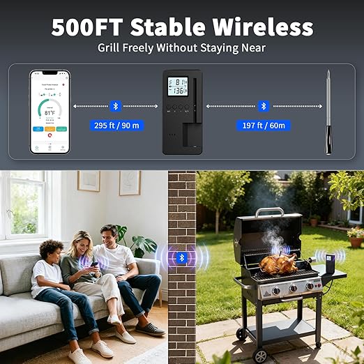 - 【500ft Wireless Connection】Smart Wireless Meat Thermometer equipped with bluetooth technology, the probe can connect to the base up to 197ft (60m), and the base can link to your phone up to 295ft (90m). Whether you’re grilling in the backyard or cooking in the kitchen, you can check real-time temperature data via your phone or the base—no need to stay by the grill constantly, enhancing flexibility during use.