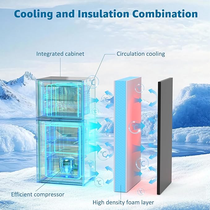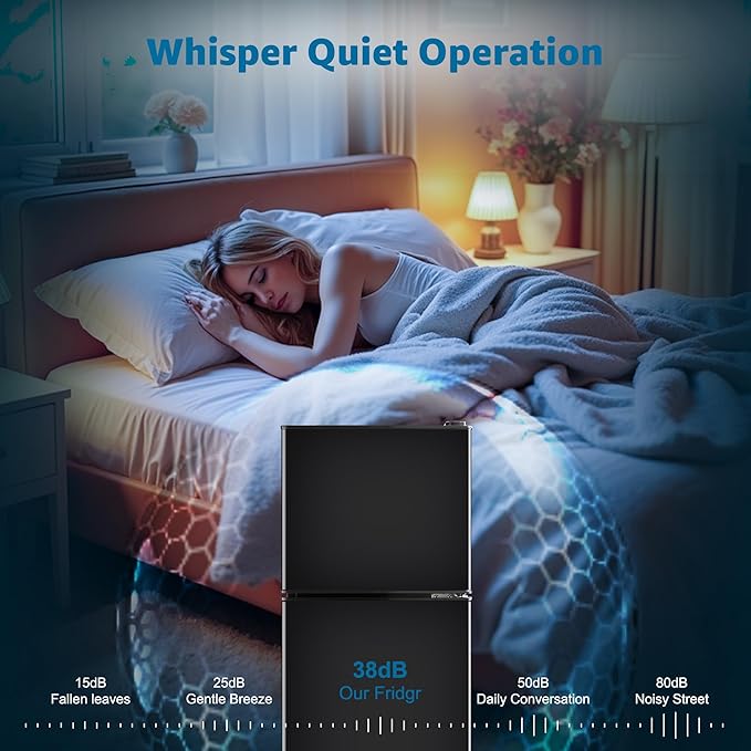 - 【Efficiency with Minimal Noise】Discover the perfect fusion of efficiency and tranquility with the remarkable performance of this mini fridge, Enjoy a peaceful living space with fridge that operates quietly at only 38dB. Additionally, our refrigerator is engineered for energy efficiency, consuming as little as 1.04 kWh per day. The whisper-quiet operation of the compressor ensures serene nights and undisturbed moments of pure bliss.