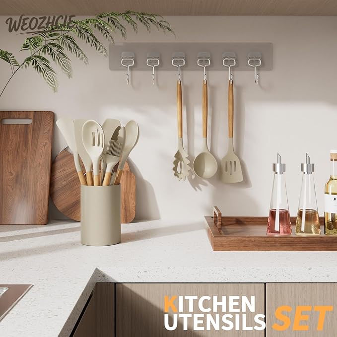 Silicone Cooking Utensil Set,12 PCS Cooking Cookware Kitchen Utensils Set for Cooking, Nonstick 446°F Heat-Resistant Cookware Kitchen Tools of Spoon,Brush,Whisk,Spatula,Turner Tongs (Khaki)