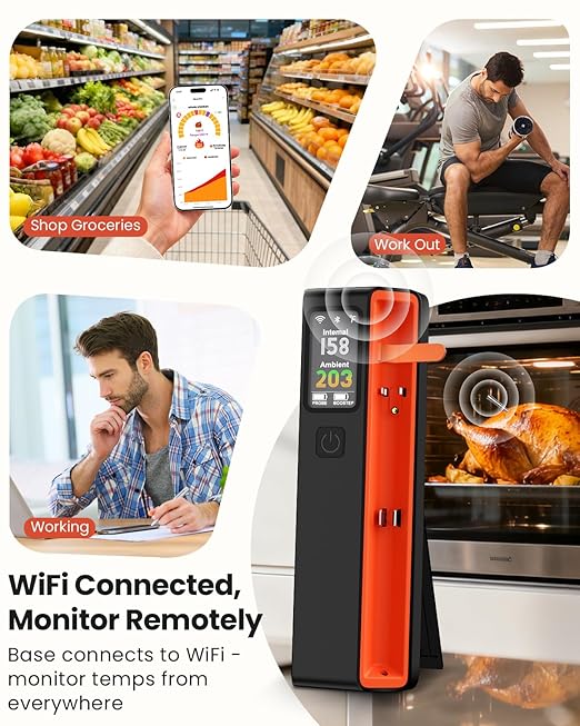 - Wireless Technology, A Must-Have for Professional Kitchens: Connect via 2.4GHz WiFi for real-time remote monitoring. Break free from space limitations and effortlessly control the doneness of multiple dishes with this wireless meat thermometer for grilling and smoking.