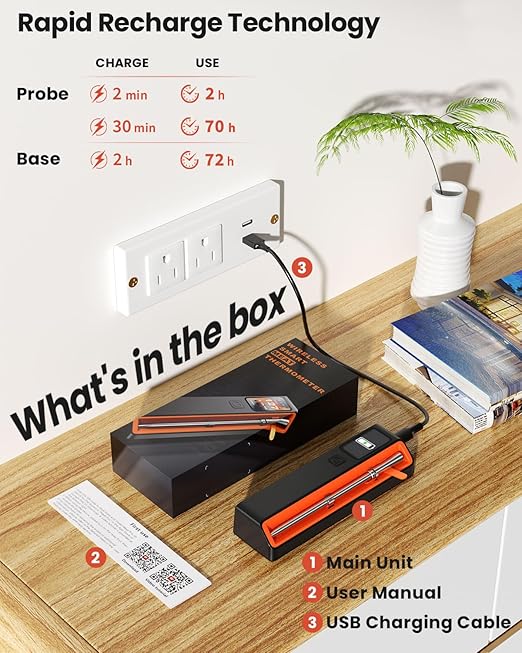 - Included Components : Wireless Meat Thermometer, Instruction Manual, Type-C Line, Storage Case