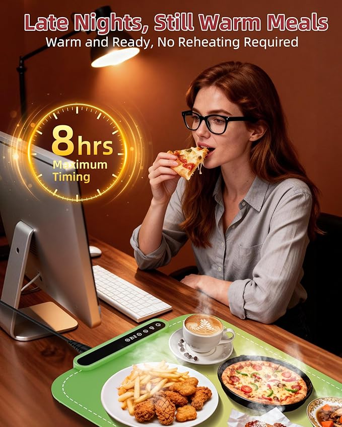 - 【7 Temperature Levels & 8 Timing Options】 The food warmer mat supports 7 adjustable temperature levels (104°F–212°F), covering low to high ranges to meet different food heating needs. It also features a built-in 1–8 hour timer that keeps food warm while locking in freshness. From baby bottles and delicate sauces to hearty meals, you can customize the perfect heating experience with ease, ensuring convenience and comfort for daily use.