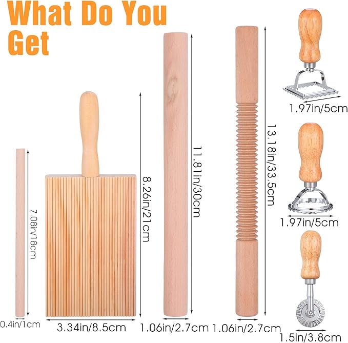 - [Complete Set] Includes 7 essential tools for making pasta and tortellini: a wooden rolling pin, pasta dough board, tortellini stamp, pasta cutting wheel, and tortellini press. The pasta-making tool is perfect for creating a variety of homemade dishes.