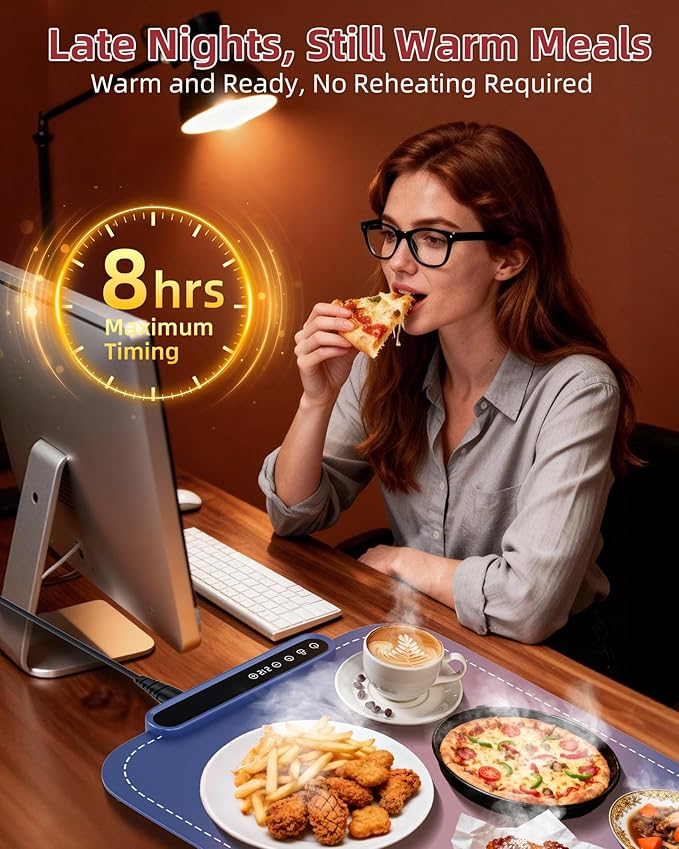 - 【7 Temperature Levels & 8 Timing Options】 The food warmer mat supports 7 adjustable temperature levels (104°F–212°F), covering low to high ranges to meet different food heating needs. It also features a built-in 1–8 hour timer that keeps food warm while locking in freshness. From baby bottles and delicate sauces to hearty meals, you can customize the perfect heating experience with ease, ensuring convenience and comfort for daily use.