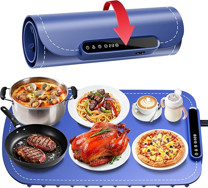 - 【Portable Storage & Space-Saving】Thanks to its flexible material and integrated design, this silicone electric heating mat is highly portable and easy to store. It can be conveniently rolled up and placed in a bag, saving up to 60% more space than traditional warming trays while avoiding ugly creases. A storage pouch is included, making it simple to carry for home, office, or outdoor use. Compact yet practical, it ensures warmth and convenience wherever you go.