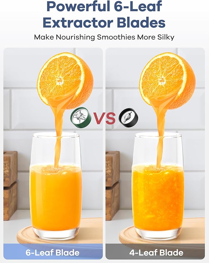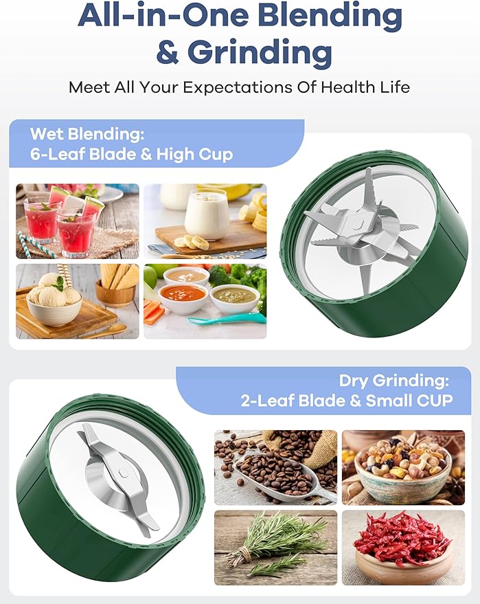 - 【Multi-Function Blenders】Your personal blender comes with a stainless steel 6-blades, make it easy to blend various hardness of ingredients, even crushing ice. Great for blending smoothies, juices, milkshakes, sauces, jams, baby food. A powerful string flat blades use cyclonic action to break down tough ingredients, great for grinding like coffee beans, spices.
