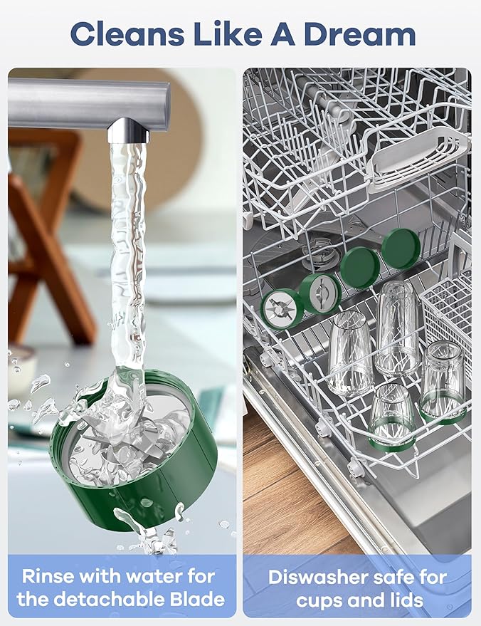 - 【Cleaning Friendly】Cleaning is a breeze – just add soap and warm water, and the blender will start its self after properly locked into the base. In addition, the smoothie maker can be easily cleaned in a dishwasher, except for the motor part (The Main Body).