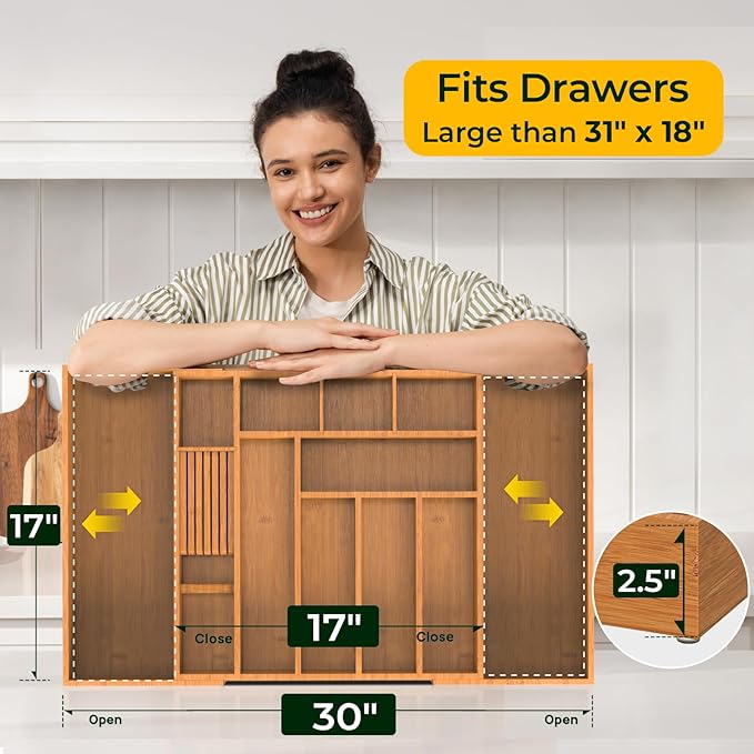 - ADJUSTABLE TO FIT MOST DRAWERS: Our organizer seamlessly expands from 17" to 30" wide, ensuring a beautiful, gap-free look in your drawer. It’s designed for drawers at least 18" long and 31" wide. It also features removable dividers, allowing you to create a custom layout for your specific tools and utensils.