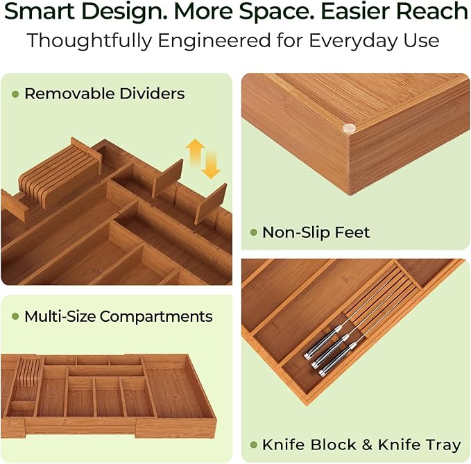 - NON-SLIP STABILITY: Includes complimentary high-grip silicone pads that lock the organizer firmly in place. Your utensils stay put, even when opening and closing the drawer quickly.