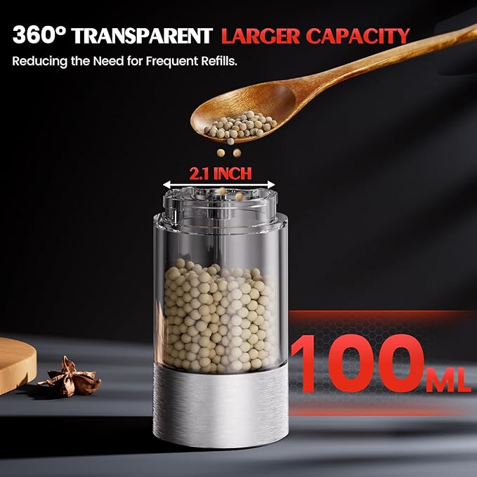 - 【Large See-Through Container 】– Fewer Refills, More Convenience. The spacious 360° transparent container lets you monitor spice levels at a glance. Lightweight and travel-friendly, it's a must-have for gatherings, camping trips, and outdoor meals