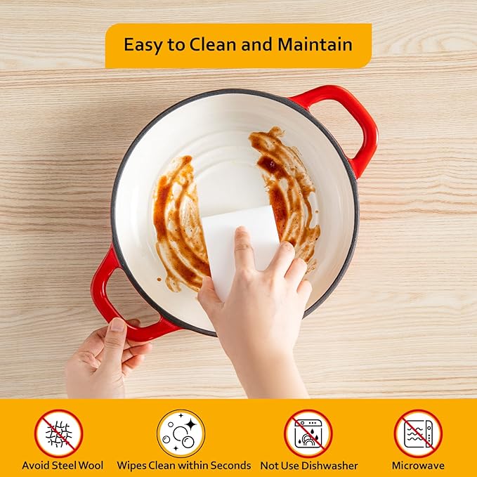 - Easy To Clean and Maintain: Simply wipe the cookware with a soft cloth and warm soapy water, then let it air dry completely before storing. This saves you scrubbing time so you can focus on the joy of baking. Do not use metal scouring pads or utensils, as they may scratch or damage the enamel coating