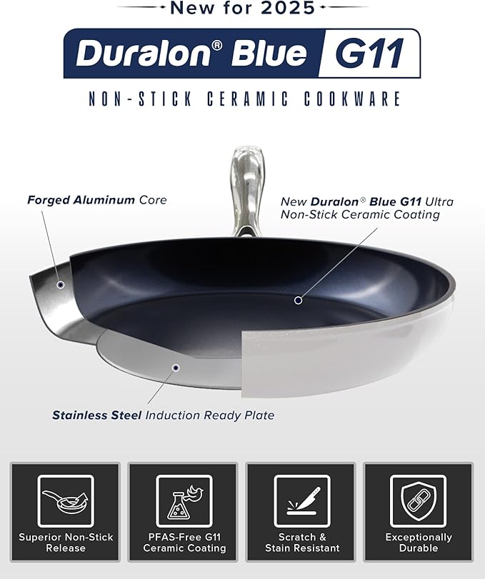 - G11 Upgrade with Diamond-Level Hardness – Now enhanced with the new G11 Duralon Blue coating, this cookware offers 30% better nonstick performance than G10. Combined with a 9H hardness rating (just below diamond), it resists scratches, chips, and corrosion—keeping the nonstick surface intact for years of flawless performance.