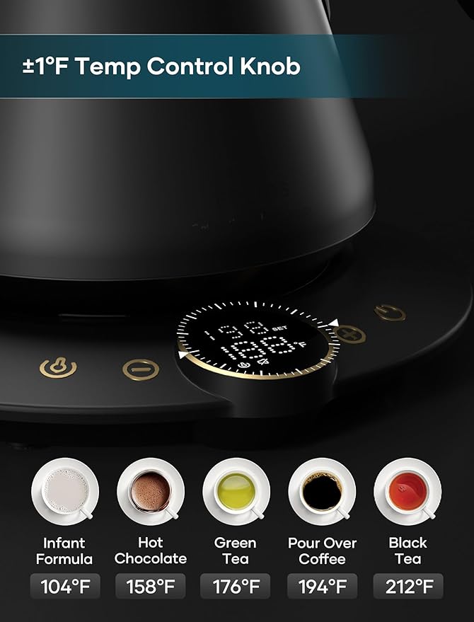 Gooseneck Electric Kettle with ±1℉ Temperature Control for Pour Over Coffee & Tea, Quick Heating, BPA-Free Stainless Steel, Built-in Brew Timer, 1500W/0.9L (Onyx Black)