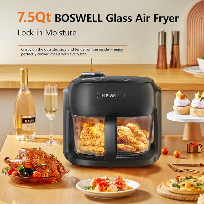 BOSWELL Steam Glass Air Fryer, 7.5QT Borosilicate Bowl with Circulating Heat, Digital Touchscreen, 400°F Max Temp, Oil-Free Fryer with Mist Function, Dishwasher Safe (Black)