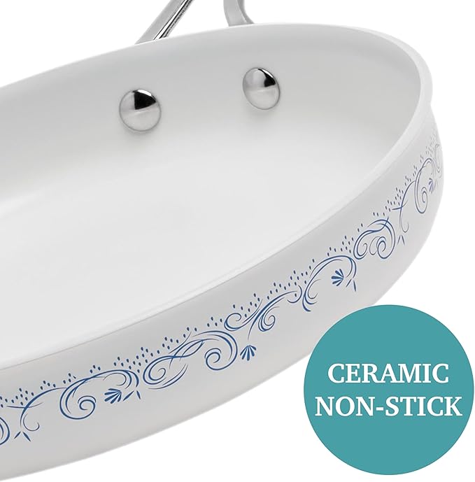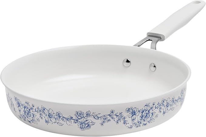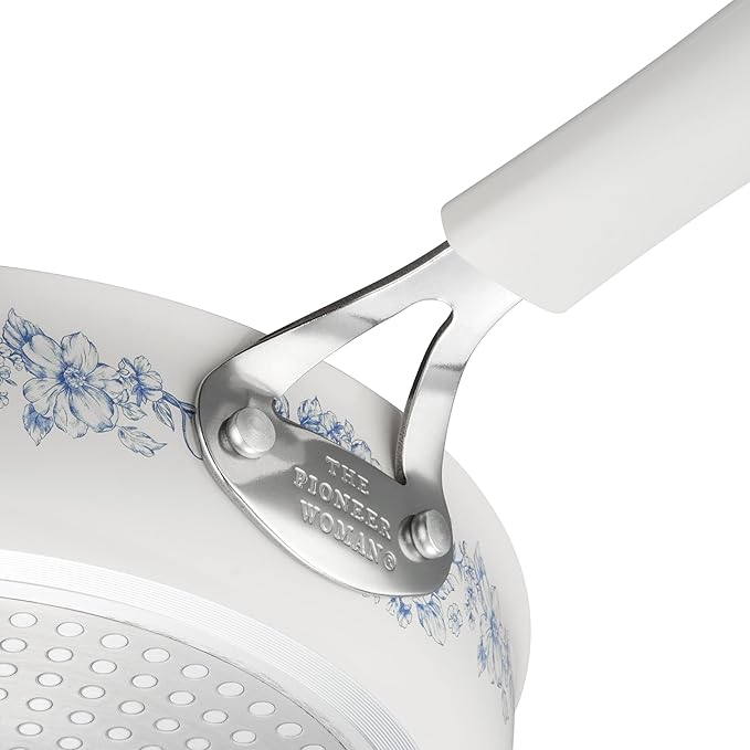 - COMFORT & CONVENIENCE FEATURES: Features riveted stainless steel handles for a secure, comfortable grip and tempered glass lids with vent holes for easy monitoring without lifting. The signature floral designs add a charming aesthetic to your kitchen.