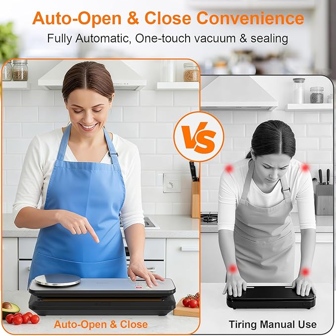 - 【Multifunctional & One-Touch Operation】This food saver vacuum sealer features fully automatic, one-touch operation with 12 versatile modes — including dry/wet settings, reusable bag & sealing, and a dual-pump auto-open/close system that eliminates the need for manual lid handling. The food saver vacuum sealer machine for space-saving efficiency. Tap. Seal. Done."