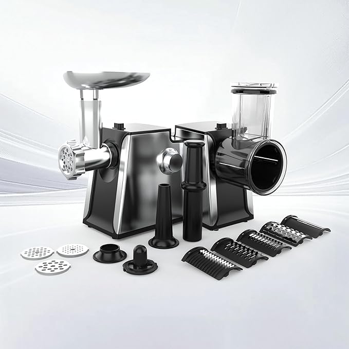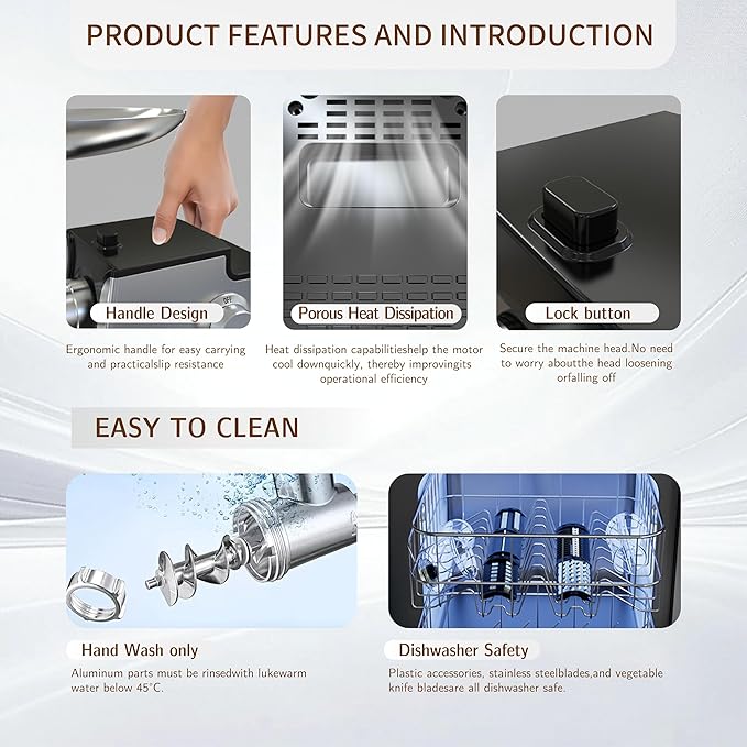 - Easy to clean: The stainless steel blades and plates and cutting blades are dishwasher safe, making cleaning quick and convenient. The multifunctional electric meat grinder and vegetable cutter is an ideal choice for busy households, ensuring hygiene and saving time. No more tedious cleaning - enjoy a worry-free cooking experience with this user-friendly design. Note: For best results, hand wash all attachments after use.