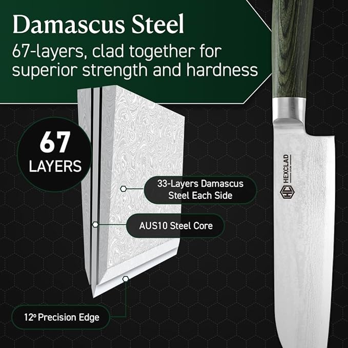 - 67 layers of Damascus steel for a harder, sharper blade that stays sharper longer. Full-tang construction for precision and control. Ergonomic pakkawood handle features anti-shrinking technology for added longevity.