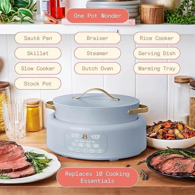Beautiful 10-in-1 Electric Multi-Cooker by Drew Barrymore, 6-quart, digital display, 10 cooking functions, non-stick pot, easy one-touch control (CornFlower Blue)