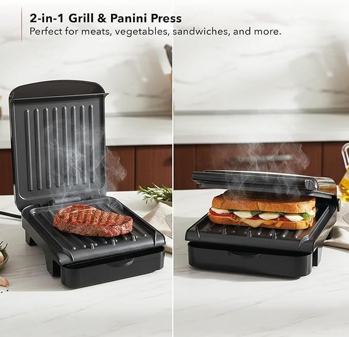 - EASY TO USE & SPACE-SAVING DESIGN β Simply plug in and preheat in few minutes, the green indicator light lets you know when itβs ready to cook. This compact grill fits easily on your countertop or neatly in a cupboard. Perfect for small apartments, dorm rooms or couples who want to save space without sacrificing convenience.