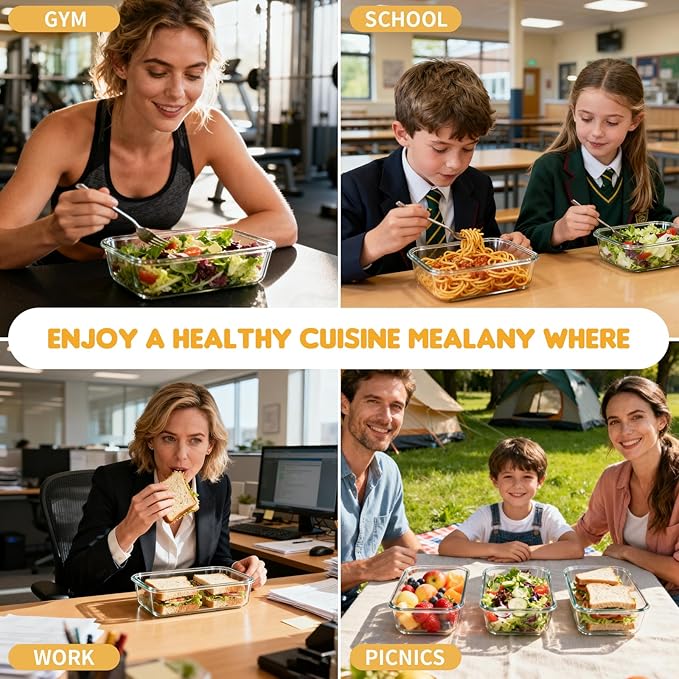 - HIGH QUALITY GLASS FOOD CONTAINERS: This glass tupperware sets are made of premium quality borosilicate glass, these glass meal prep containers are microwave, freezer, and oven safe, allowing you to conveniently heat up your meals, freeze leftovers, or even bake and reheat dishes. It can safely go from the freezer to the microwave without cracking