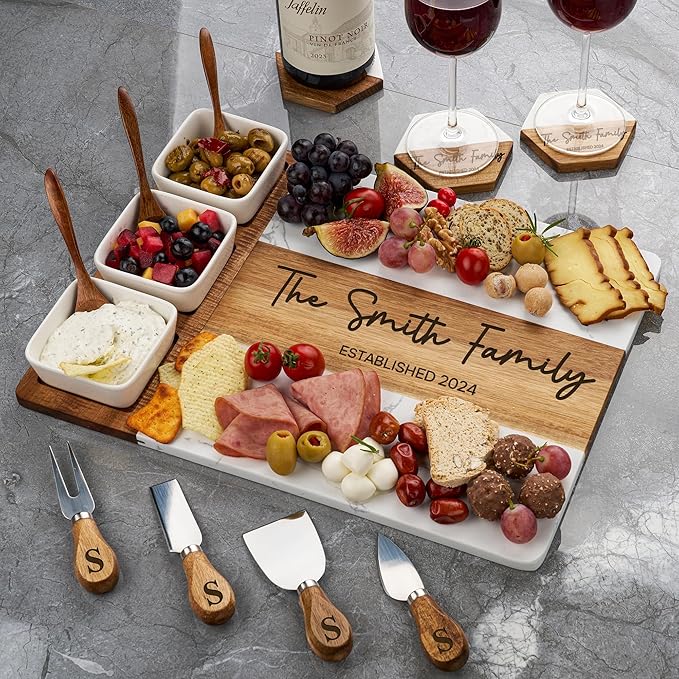 AWESOMETIK Luxury Personalized Acacia Wood & Marble Cheese Board – Custom Engraved Charcuterie Board with Knife Set – Bridal Shower & Housewarming Gift