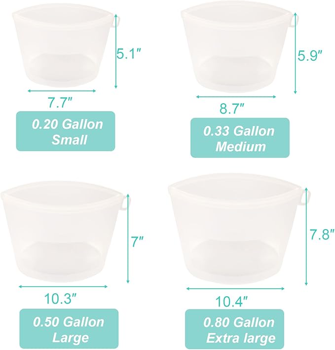 - Complete Set with Multiple Sizes This versatile set provides everything you need. You will receive 4 reusable bags in multiple sizes (1 small size 0.2 Gallon, 1 Medium size 0.33 Gallon, 1 Large size 0.5 Gallon, 1 Extra large size 0.8 Gallon) to store a wide variety of food and items.