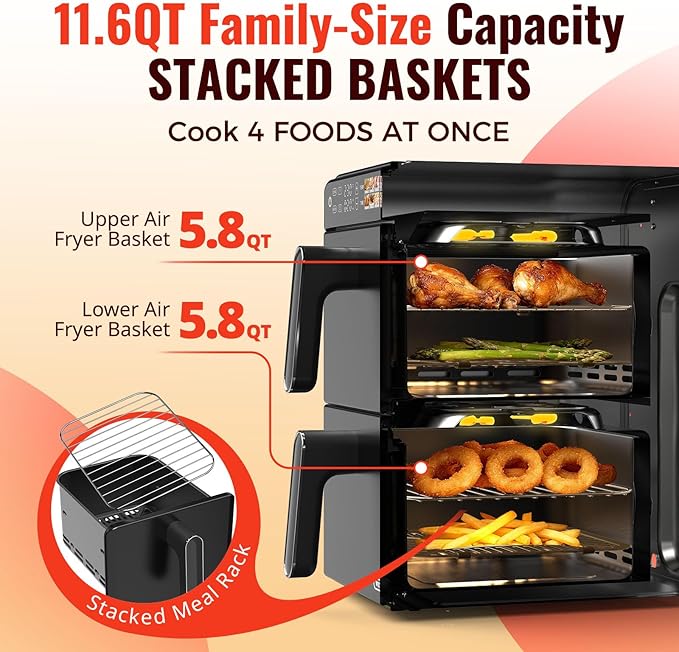 - 【Space-Saving Dual-Layer Vertical Design】11.6QT Double Air Fryer with innovative vertical tower design and dual independent 5.8QT baskets takes up 50% less counter space than wide side-by-side models. Chromed stacked meal racks let you cook up to 4 foods at once—perfect for family meals or meal prep.