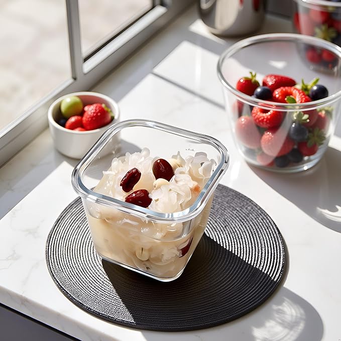 - Space Saving Square Design : Stackable 4cup square glass soup containers with lids maximize fridge/pantry space; use as 32 oz soup storage containers or glass fruit storage containers for fridge