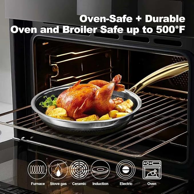 Fogdream 10” Pots and Pans Set Non Stick, Stainless Steel Pan with Lid, Dishwasher and Oven-Safe Frying Pan, PFOA Free and Induction Compatible Cookware Set, Gold