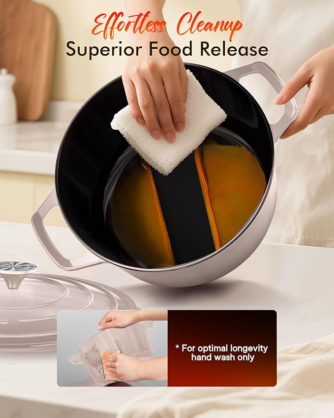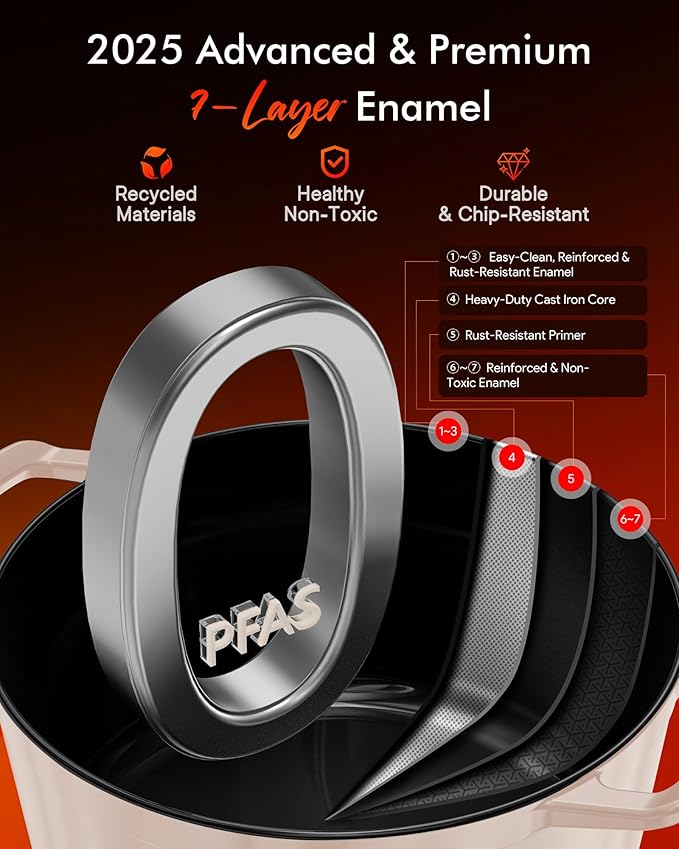 - 2025 Advanced & Healthy 7-Layer Enamel - Made from recycled materials and free of PFAS, PTFE, and PFOA, this Dutch Oven boasts ultra-durability and chip-resistance. The 7-layer construction is anti-corrosion, wear- and rust-resistant with heavy-duty cast iron at its core, ensuring it is not only durable but also easy to clean. Designed and built for everyday cooking, from Sunday stews to bread baking.