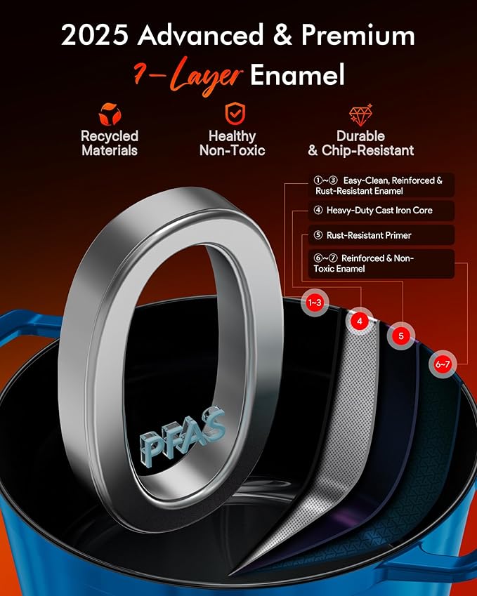 - 2025 Advanced & Healthy 7-Layer Enamel - Made from recycled materials and free of PFAS, PTFE, and PFOA, this Dutch Oven boasts ultra-durability and chip-resistance. The 7-layer construction is anti-corrosion, wear- and rust-resistant with heavy-duty cast iron at its core, ensuring it is not only durable but also easy to clean. Designed and built for everyday cooking, from Sunday stews to bread baking.