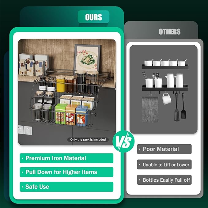 - 🔄 PULL-DOWN 3-TIER SPICE RACK: Built-in buffer lifting mechanism lets you lower the entire 14.6" × 7.9" × 7.9" frame smoothly to eye level so you can grab bottles stored high inside the cabinet without risk of sudden drop or injury.