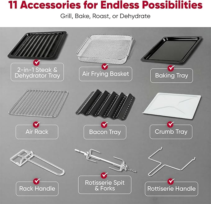 - 9 PREMIUM ACCESSORIES INCLUDED: Comes with an air fryer rotisserie oven basket, baking tray, rack, crumb tray, steak/dehydrator tray, rotisserie spit & forks, handle & rack tool-everything you need to air fry, roast, bake, or dehydrate in this large stainless steel air fryer oven.