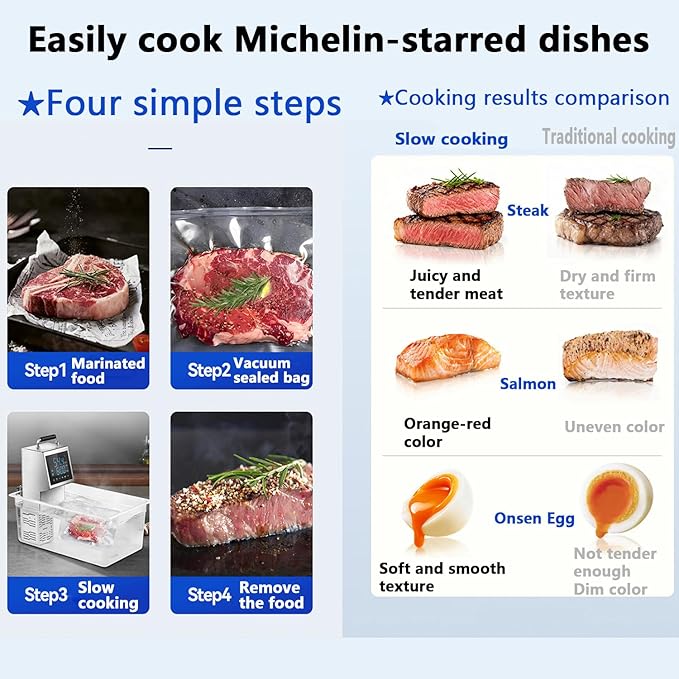 - 【WIDE RANGE OF APPLICATIONS】: Sous Vide Precision Cooker Customizable recipes for ingredients such as soft-boiled eggs, steak, lamb chops, lobster, bacon, and baked goods. Effectively prevents overcooking, preserving more nutrients and vitamins, allowing you to enjoy the delicious flavors of a star chef every time
