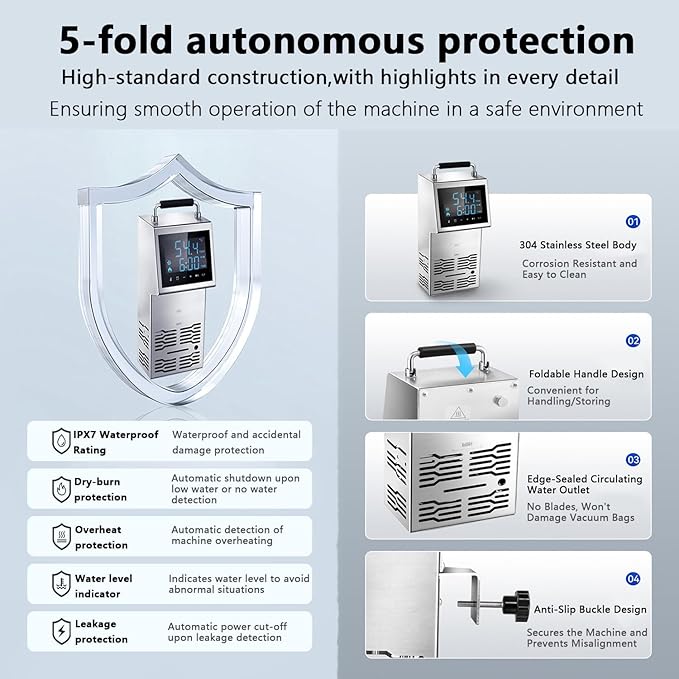 - 【SAFETY PROTECTION】: Sous vide wand Features anti-dry burning, anti-overheating, water level indicator, and leak-proof functions. Fast heating, large capacity, easy to use, and durable. LED displays offer a clearer and more intuitive viewing experience, delivering an unparalleled cooking experience